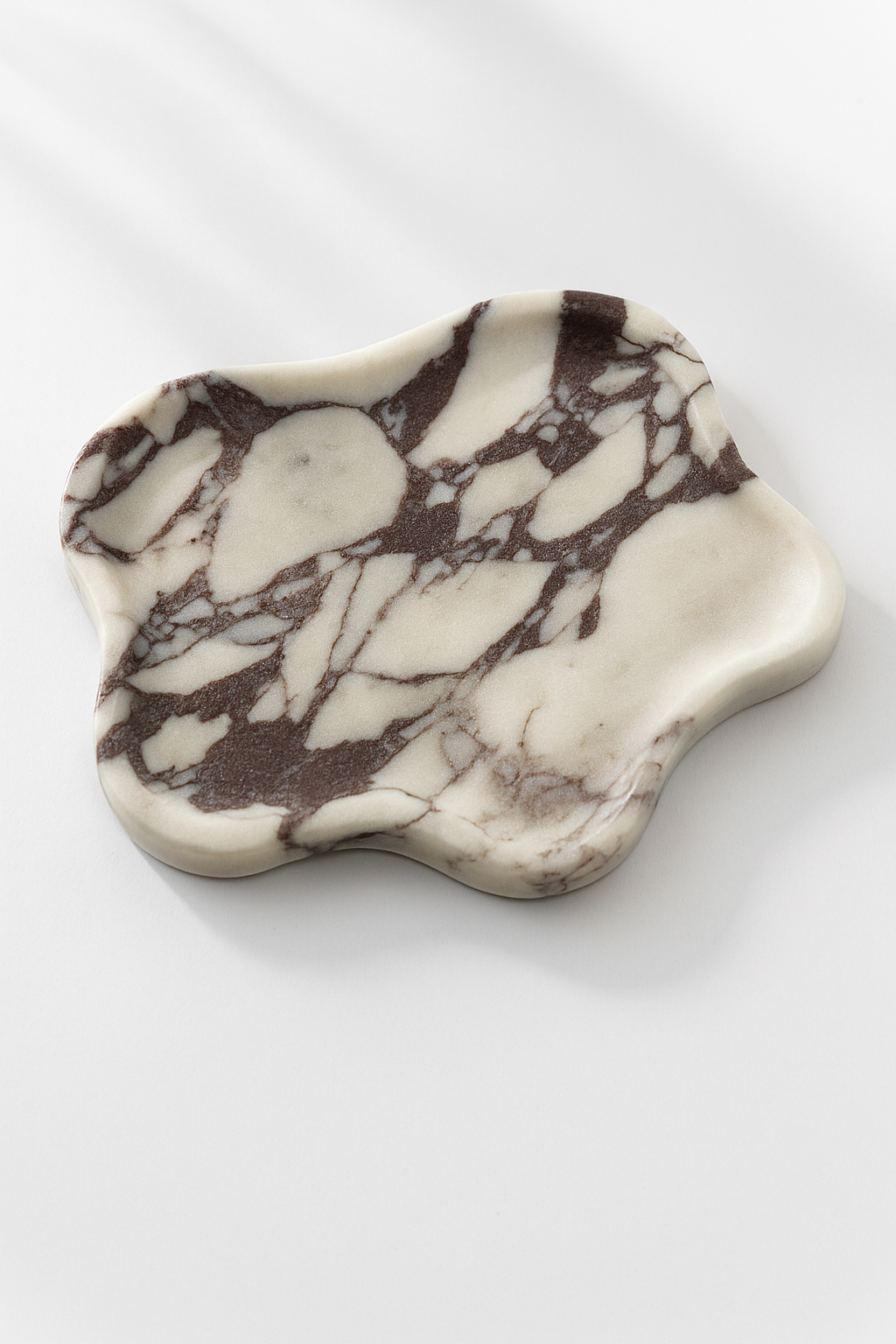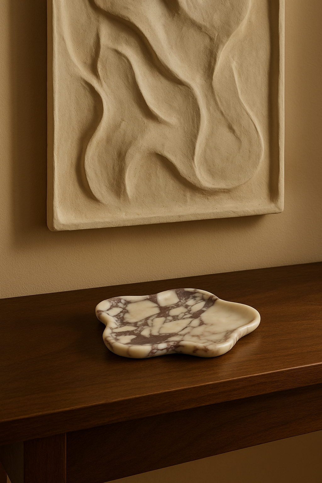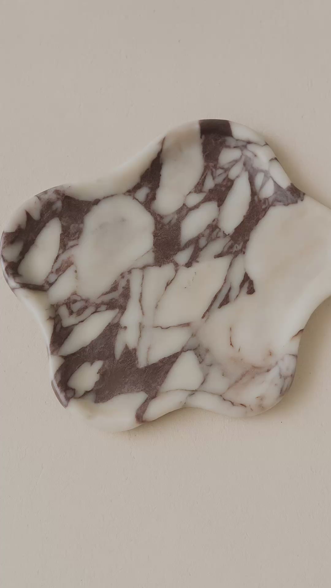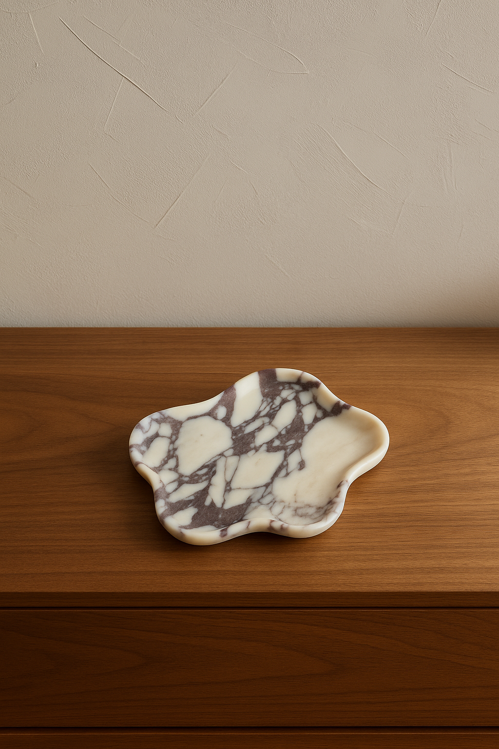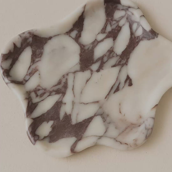 Crafted from exquisite Calacatta Viola marble, this handmade tray features rich burgundy veining against a soft creamy backdrop. Its satin matte finish preserves the natural beauty and tactile texture of the stone, adding a quiet elegance to any setting.